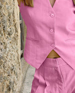 Introducing this pink vest and skirt set from BoiiLife. This suit is a casual style for work. Whether it's suitable for everyday use or for the office. The pure cotton fabric and simple solid color combined with this basic version make this suit look unique and modern. Make sure you feel relaxed and comfortable while still looking formal. You can easily wear it with high heels or flat shoes. Wearing high heels gives a strong and formal style. Wearing flat shoes is a casual style. No matter how you wear it, you can't go wrong in this suit. It makes you look elegant and mature!