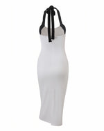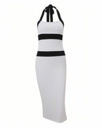This sophisticated midi dress hugs your curves with a sleek bodycon fit. A chic halter neckline flows into a daring backless design, while bold contrasting panels add a modern edge to this timeless, figure-flattering piece.