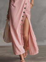 Discover the charm of retro elegance combined with sporty chic in our Elegant Retro Sporty Hooded V-neck Sleeveless Lace Trim Side Slits And Button Pink Cotton Midi Dress. This unique piece is designed with versatility and sophistication in mind, perfect for both casual outings and special occasions.