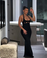 This maxi dress hugs your curves with a sculpting fit, while bold cutout details and a sleek halter neckline add a touch of seduction. A subtle back slit ensures effortless movement, blending sophistication with just the right amount of drama.
