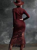 What sets this dress apart is the exquisite lace hem that adds a delicate touch and a hint of romance. The intricate lace detail contrasts beautifully with the knitted fabric, creating a stunning visual effect. Whether paired with ankle boots for a cozy autumn look or dressed up with heels and accessories for a more formal occasion, this maxi dress is a timeless addition to any wardrobe, showcasing understated elegance with versatility.