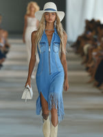 The Vintage Blue Denim Zipper Pocket Slit Tassel Sleeveless Midi Dress is a must-have for those who appreciate the blend of classic and contemporary fashion. Its unique details and versatile design make it a perfect addition to any wardrobe, suitable for various occasions.