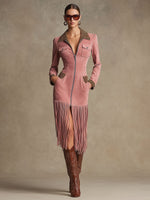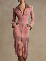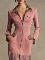This western retro midi dress combines bold patterns and playful textures, featuring a leopard print with a unique pink faux suede fabric. The integration of a classic leopard design with vibrant pink brings a fresh and eye-catching aesthetic to the ensemble. The dress is accentuated by a zipper front, adding a modern and functional element, while tassel details provide an extra layer of western flair and movement.