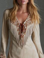 Infused with vintage western allure, the Western-Style Tie-Up Embroidered Fringed Faux Suede Long-Sleeved Mini Dress stands out for its intricate craftsmanship and tactile richness. The soft faux suede drapes beautifully, enhanced by embroidered accents and layers of fringe that sway with natural rhythm. The tie-up neckline and long sleeves balance rustic authenticity with modern style. Perfect for festivals, concerts, or city outings, this dress delivers effortless movement and unmistakable frontier chic.