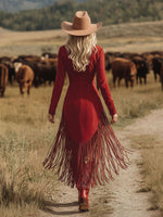 Enhancing its unique character, the dress is embellished with playful red fringes that sway with every movement, capturing the spirit of bohemian freedom. These fringes run along the sleeves and hem, adding both texture and a fun, dynamic element to the design. The dress falls to a graceful midi length, making it versatile enough for both casual outings and more formal events. Whether paired with a wide-brimmed hat for a day out or dressed up with statement jewelry for an evening affair, this Western-style vintage dress is a statement piece that promises to turn heads.