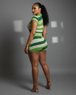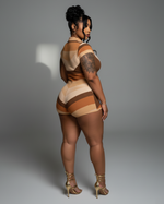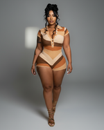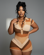 Retro with a baddie twist, the Ellay Romper brings curves and confidence in one sleek piece. Designed with a deep V button-up front and collared neckline, it hugs the body with a snug knit fit while the contrast color keeps it striking from every angle.