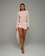 The Alteya Set strikes the perfect balance of sultry and refined. Featuring a lace bodysuit with a sleek high neckline and a draped mini skirt with side-tie detail, this duo is designed to sculpt and flatter while keeping the vibe effortlessly elevated.