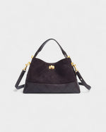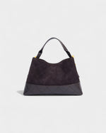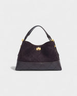 The Elviera Bag redefines classic elegance with modern edge. Its quilted suede upper meets a structured leather base, creating a rich contrast in textures. Finished with a gleaming twist-lock closure and curved top handle, it’s the kind of piece that turns minimalism into a quiet statement.