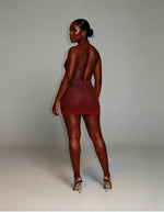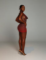 She’s giving shimmer, sculpt, and serious heat. The Imogen mini hugs every curve with a bodycon fit and plunging cowl neckline. Glitter ombré and rhinestone detailing fade from soft to bold, catching light with every step. Finished with a halter tie and stretch ruching for that perfect snatched shape.