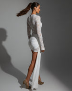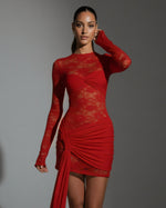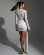 The Kiana Dress is an irresistible fusion of romance and drama. Crafted in delicate lace, it features long sleeves, a sheer fitted bodice, and a sweetheart-style bust detail. The ruched mini skirt is finished with an elegant draped sash that cascades down the front, adding movement and allure.