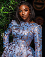 The Mirasol Midi Dress is a statement in refined elegance. Designed with a structured bodice and a full pleated skirt, it creates a sculpted silhouette that flatters every curve. The long sleeves and high neckline balance the bold floral pattern, while the luxurious fabric adds depth and sophistication to the look.